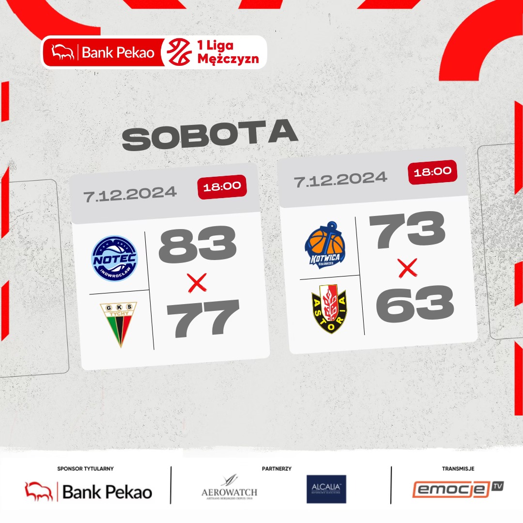 Niepokonana od połowy października Enea Abramczyk Astoria straciła punkty w Kołobrzegu. Lider Pekao S.A. 1 Ligi Mężczyzn uległ Sensation Kotwicy Port Morski 63:73, mając duże problemy na linii rzutów wolnych. Z drużyną z Kujawsko-Pomorskiego w tabeli zrównało się Miasto Szkła, które prowadziło przez niemal cały mecz w Opolu, ale decydującą o zwycięstwie akcję przeprowadziło w samej końcówce. Ponownie zaciętą końcówkę rozegrało także WKK Active Hotel.